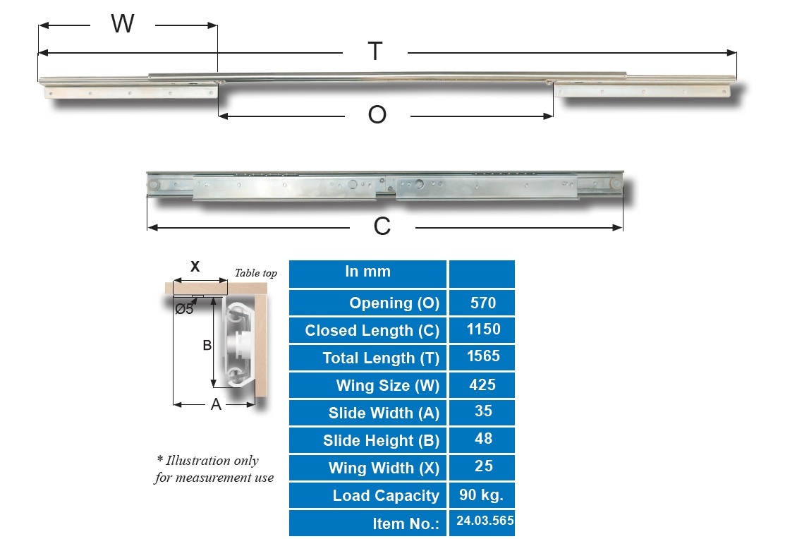 Kugle bordudtræk i forzinket stål med stålwire som gør at bordpladerne glider synkront fra hinanden på midten.