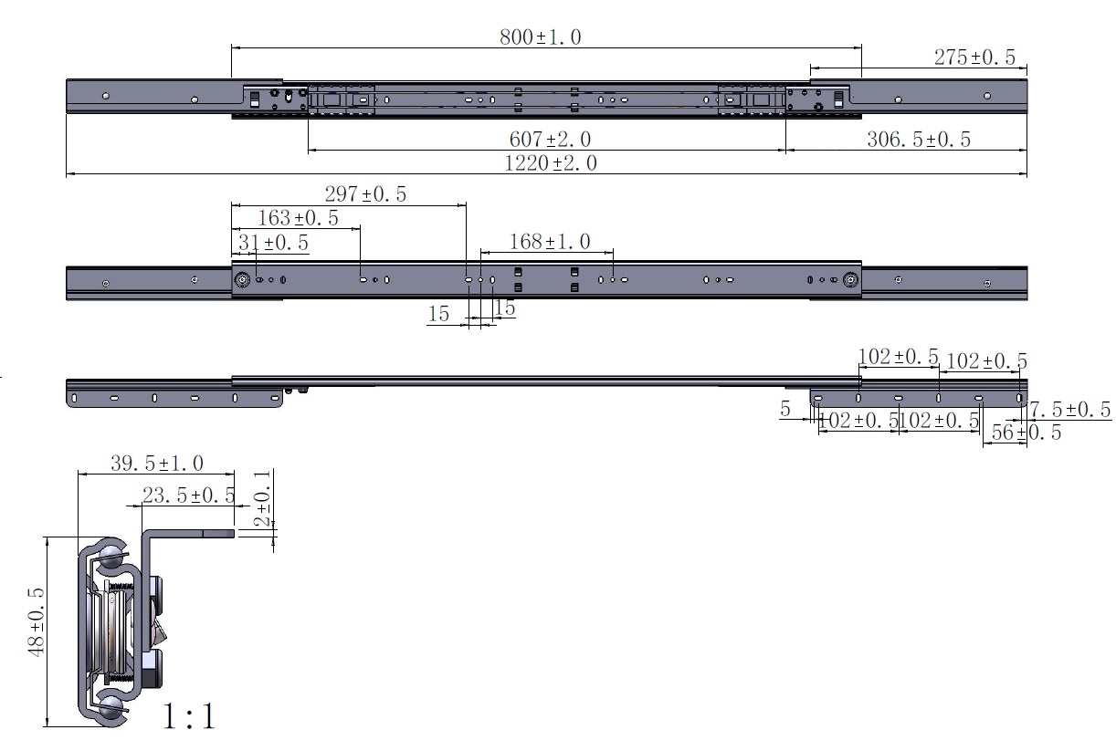 Kugle bordudtræk i forzinket stål med stålwire som gør at bordpladerne glider synkront fra hinanden på midten.