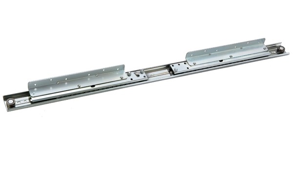 Kugle bordudtræk i forzinket stål med stålwire som gør at bordpladerne glider synkront fra hinanden på midten.