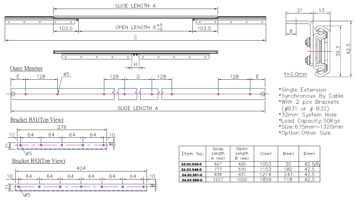 Kugle bordudtræk i forzinket stål med stålwire som gør at bordpladerne glider synkront fra hinanden på midten.