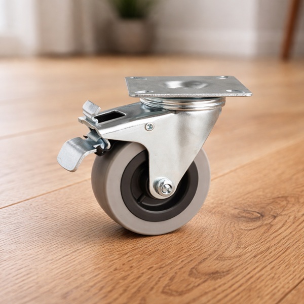 Slidstærkt drejbart hjul med fuld metal bremse - dvs hjulet kan hverken køre eller dreje når bremsen er ned.