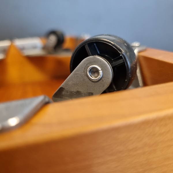 Puf/møbelhjul med stål hjørnebeslag, som f.eks. kan bruges under blomsterkasser eller lignende, som man gerne vil kunne rulle med.
