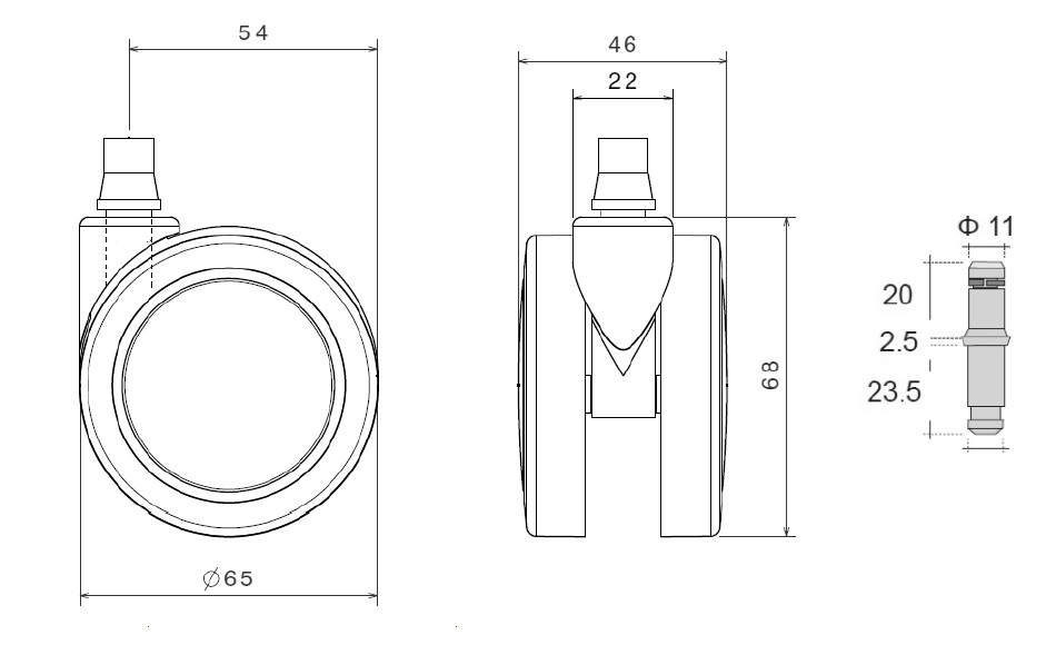 b>Kontorstolhjul "Didius" ø65 mm - Blødt hjul med ø11 mm tap