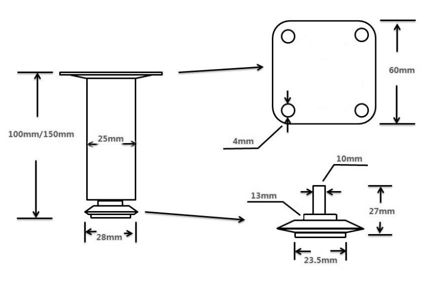 Højdejusterbart møbelben. Leveres med stillefod ø28 mm, så benet yderligere kan justeres med 10 mm i højde.