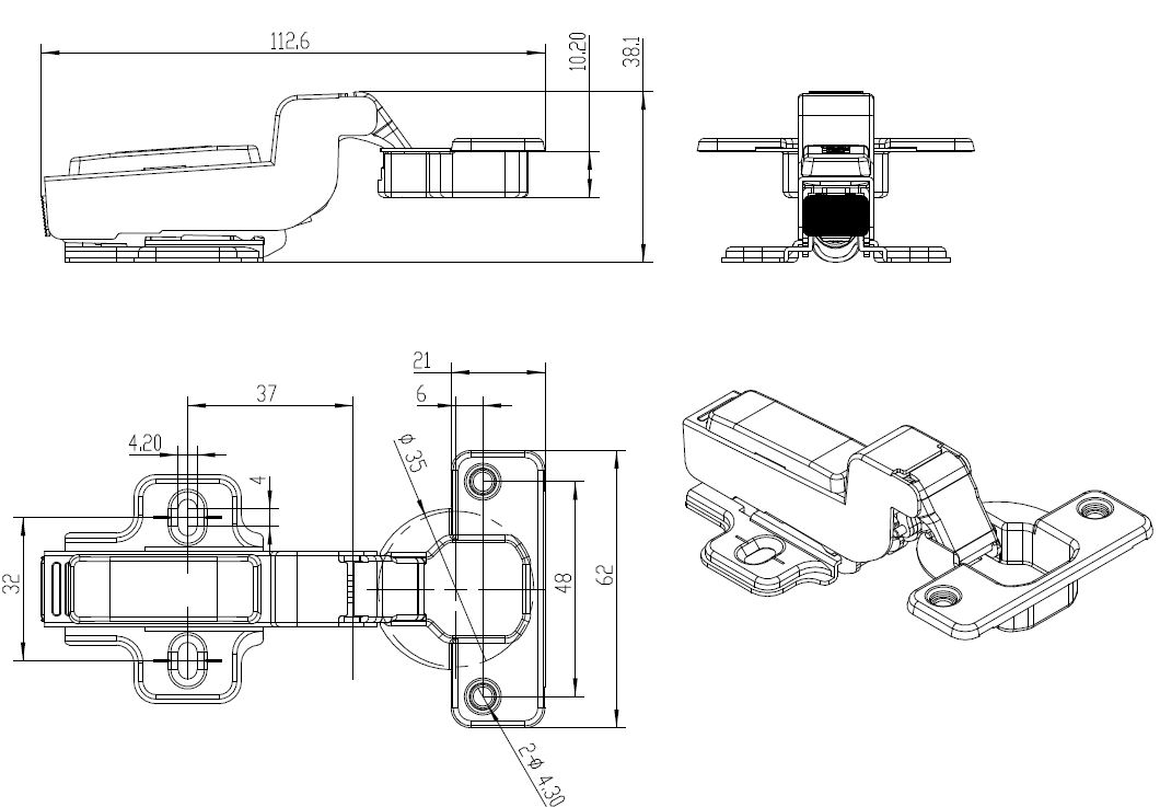 Hulafstand (cc): 48 mm - hullerne forskudt 6 mm fra centrum af ø 35 mm kop.
