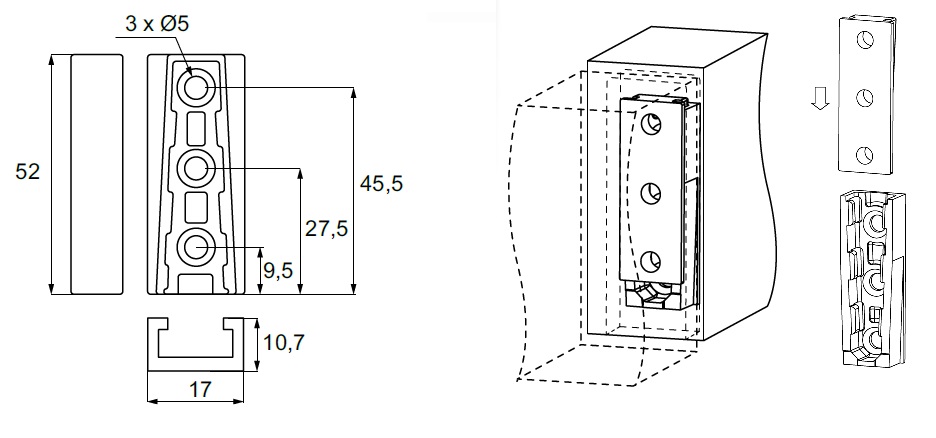 Hægtebeslag Hun-Del - 52x11x17mm - til Han-Del 101509