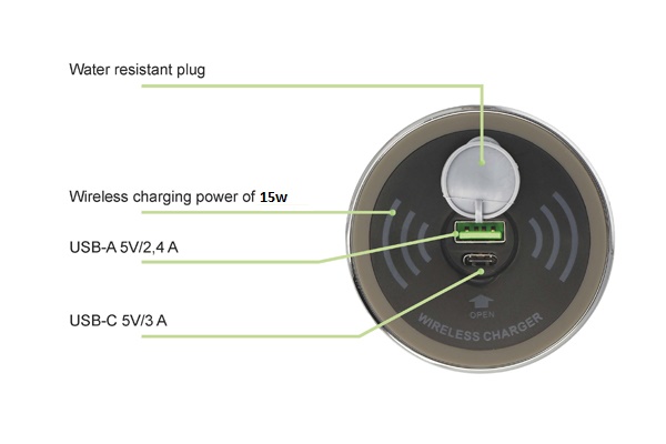Praktisk og stilren trådløs oplader til indbygning i bordplader, sengeborde, reoler og meget mere. Med både QI-funktion og USB-porte sikrer den maksimal fleksibilitet i opladningen – uanset om din mobil understøtter trådløs opladning eller ej.