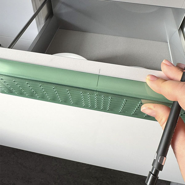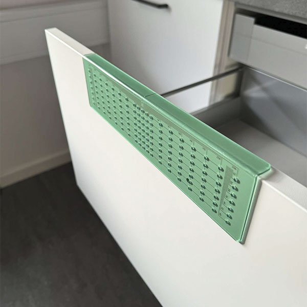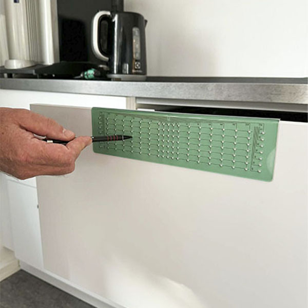 Skabelonen justeres nemt til det ønskede C/C-mål, hvorefter du blot kan markere eller bore direkte igennem hullerne. Det transparente materiale gør det let at se frontens kanter og sikre perfekt positionering på både lodrette og vandrette flader. Det giver ekstra tryghed, især når du arbejder med nye og flotte fronter, hvor der ikke er plads til fejl.