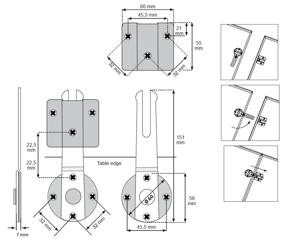 Til sammenkobling af f.eks borde i lange lige rækker. Han-delen kan drejes ind under bordet, så den er usynlig, når beslaget ikke anvendes.