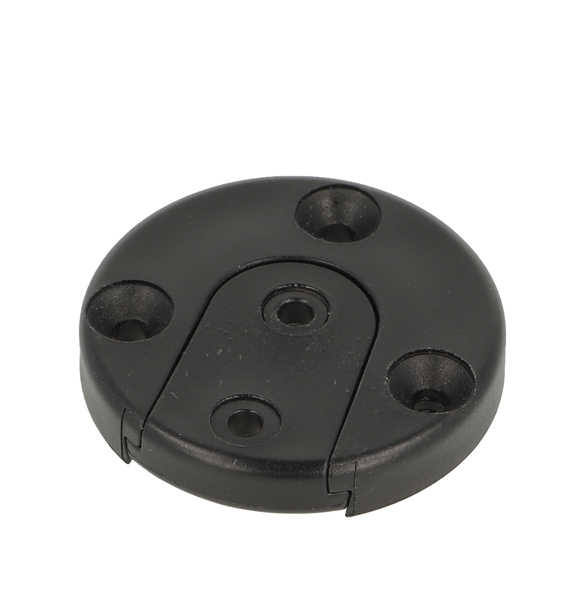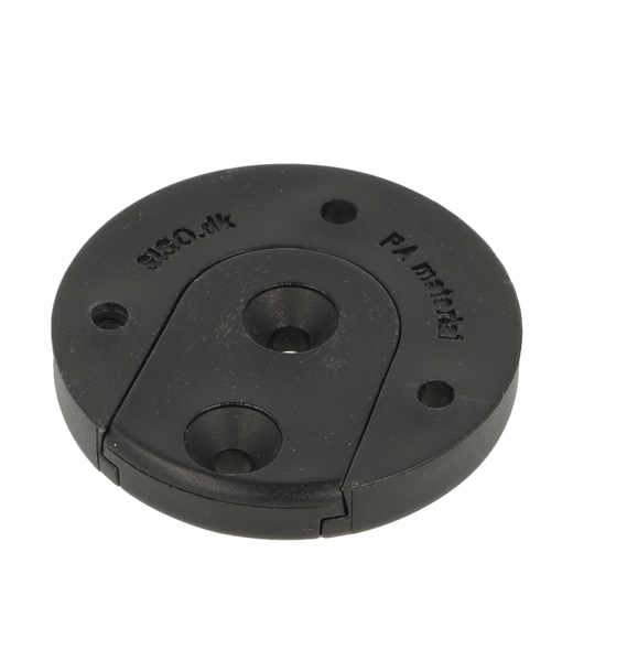 Den runde hun-del monteres direkte på væggen, mens han-delen monteres på skabet eller emnet. Når de to dele skubbes sammen, låses beslaget mekanisk, og emnet sidder stabilt fast. Typisk anvendes 2 sæt beslag pr. skab, afhængigt af vægt og størrelse.